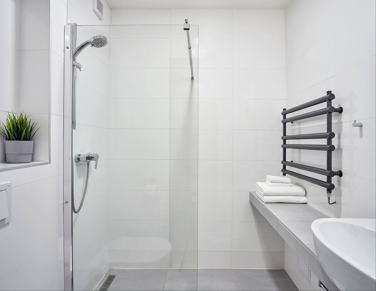 - There is no threshold or step between the shower and bathroom floor