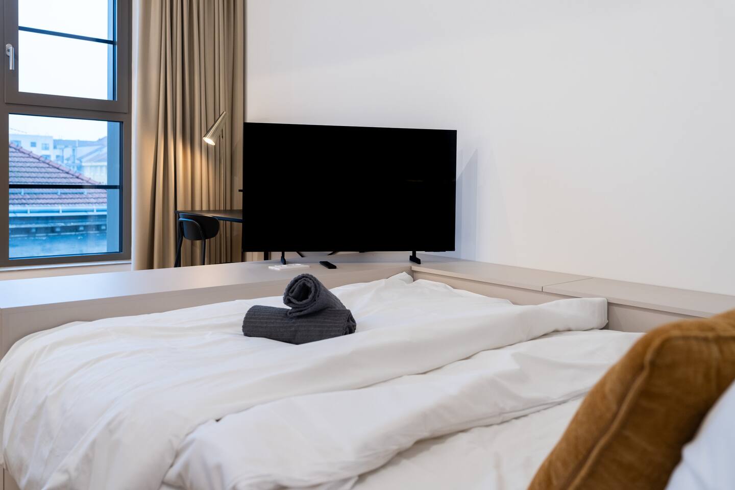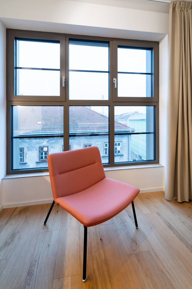 Dream Boutiques Studio is a soft, calming studio for two, designed with gentle textures and a warm atmosphere. A full-wall window adds brightness while preserving the cosy feel. Guests enjoy a 24/7 reception and delicious breakfast options in the on-site bakery and café.